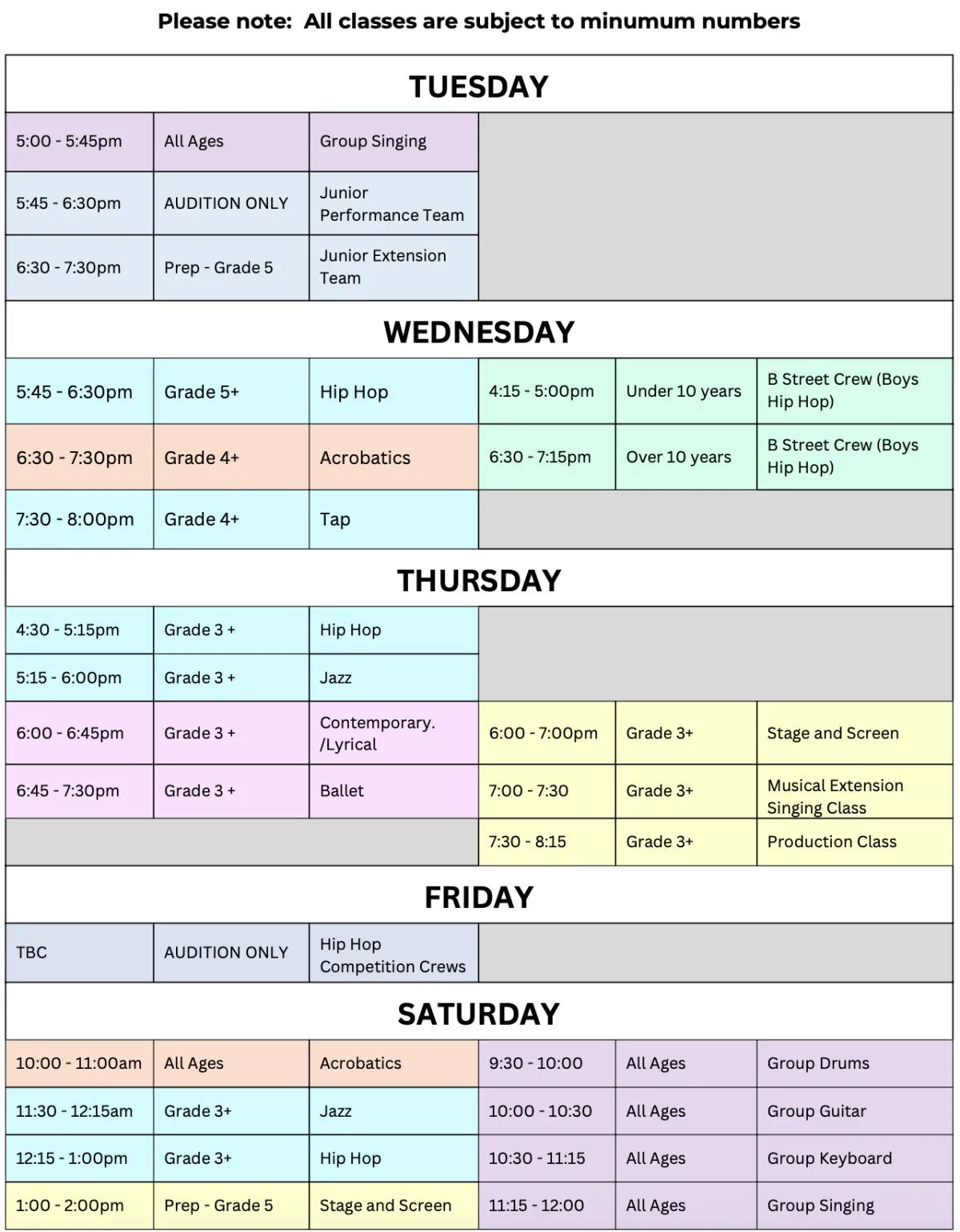 Troupes and Performance Teams.Not included: Music Classes, Solo and Duo Classes (these are added separately).