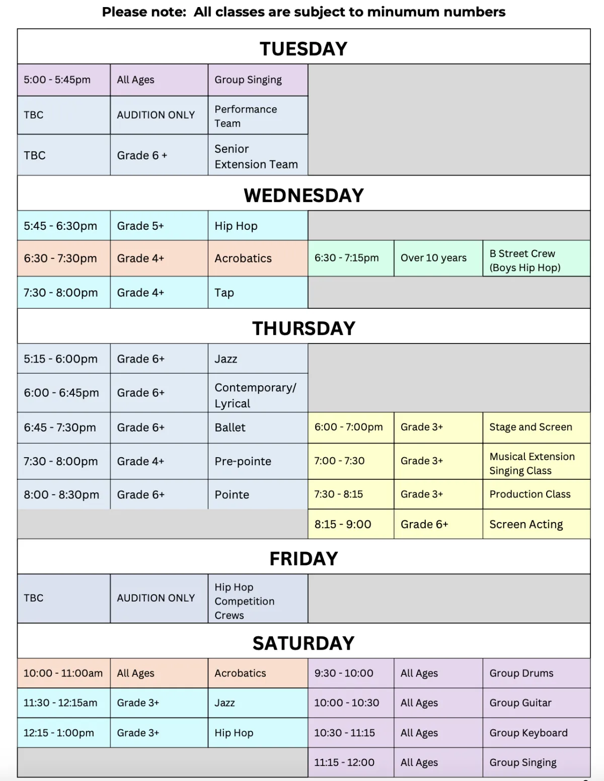Troupes and Performance Teams.Not included: Music Classes, Solo and Duo Classes (these are added separately).