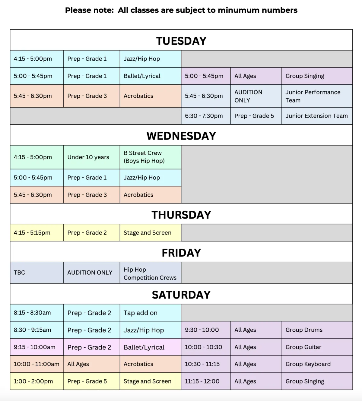 Troupes and Performance Teams.Not included: Music Classes, Solo and Duo Classes (these are added separately).